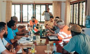 Das eingeschiffte Inventar und Baumaterial, das anschliessend von den Seychellen übernommen wird, mussten auf Kleinfahrzeugen vor Ort gebracht werden. Es folgte eine erste Schulung in Gerätekunde, Arbeitssicherheit und Seilsicherungstechnik.