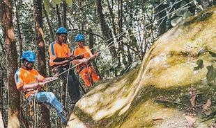 Im felsigen Gebiet Bel Ombre werden einzelne Blöcke temporär vernetzt, um sie mit einem Handgerät zu spalten und kontrolliert abzubauen. Gemeinsam mit den lokalen Arbeitern werden auf diese Weise 920 m Verankerungen, 450 Quadratmeter Netzabdeckungen und 200 m Verseilungen gebaut sowie 50 Kubikmeter Fels abgebaut.