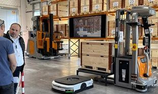 Der beim IFOY bis in die Reihe der Finalisten vorgedrungene LogiRobot AMR, ein halbautomatisches Heckgabel-Flurförderzeug mit zusätzlicher Handbedienung mittels einer klappbaren Deichsel, befördert nach der manuellen Lastaufnahme ohne weiteres Zutun des Bedieners Paletten zum Abladen an den richtigen Ort.