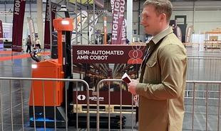 Der beim IFOY bis in die Reihe der Finalisten vorgedrungene LogiRobot AMR, ein halbautomatisches Heckgabel-Flurförderzeug mit zusätzlicher Handbedienung mittels einer klappbaren Deichsel, befördert nach der manuellen Lastaufnahme ohne weiteres Zutun des Bedieners Paletten zum Abladen an den richtigen Ort.